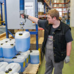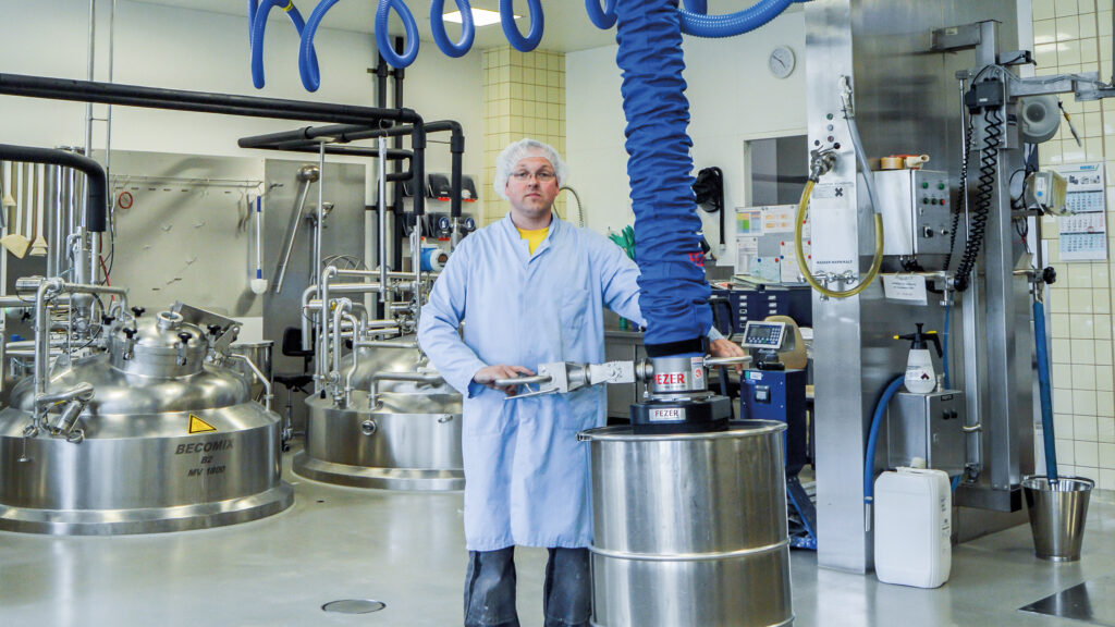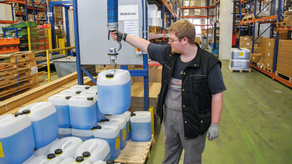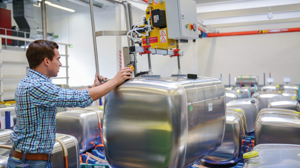 VacuPowerlift VPL-60kg. Tublyftare med pneumatisk gripfunktion för hantering av flera plastdunkar samtidigt.