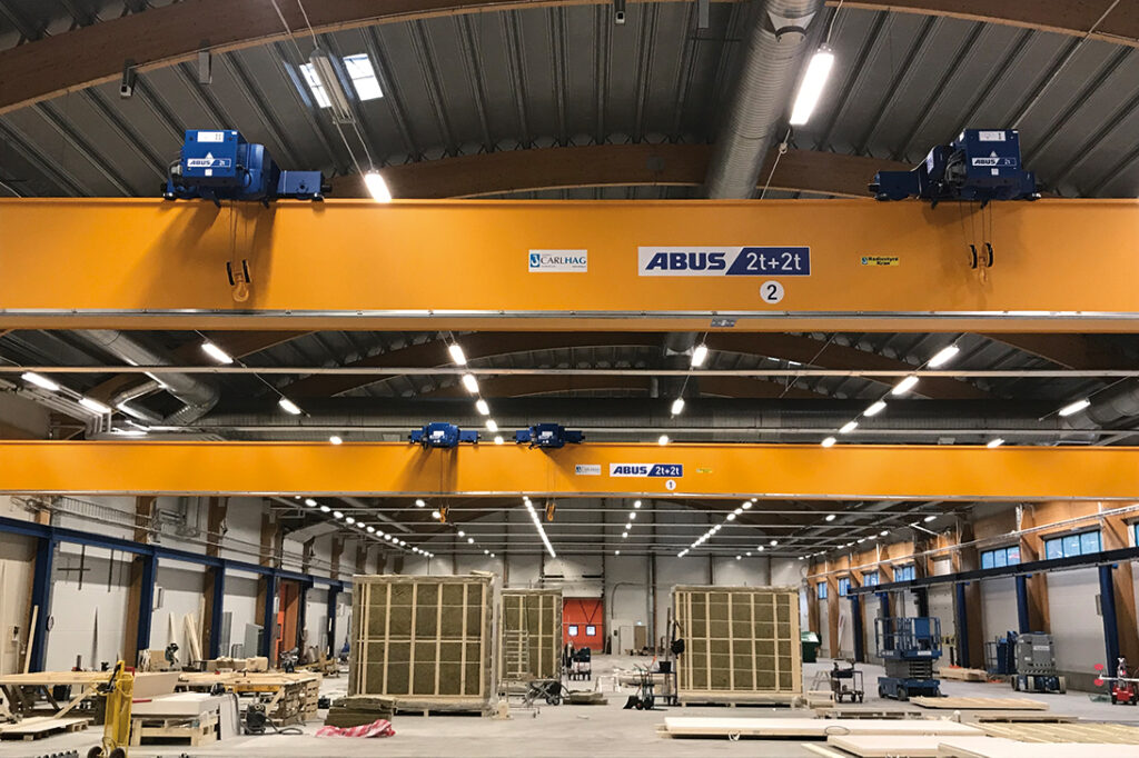 Tillverkning av prefabricerade lägenheter är en utrymmeskrävande verksamhet som kräver traverser med stor spännvidd. Grännäs valde därför två stycken ABUS ELS 2+2-tonstraverser av enbalkstyp med en spännvidd på 30 640 mm till den 6 000 m2 stora produktionshallen. Varje travers utrustades med två sidomonterade telfrar för att maximera krokhöjden. Den 84 meter långa kranbanan monterades på sammanlagt 22 pelare, varav ca hälften utrustades med konsoler för att de inte skulle vara i vägen för produktionen.