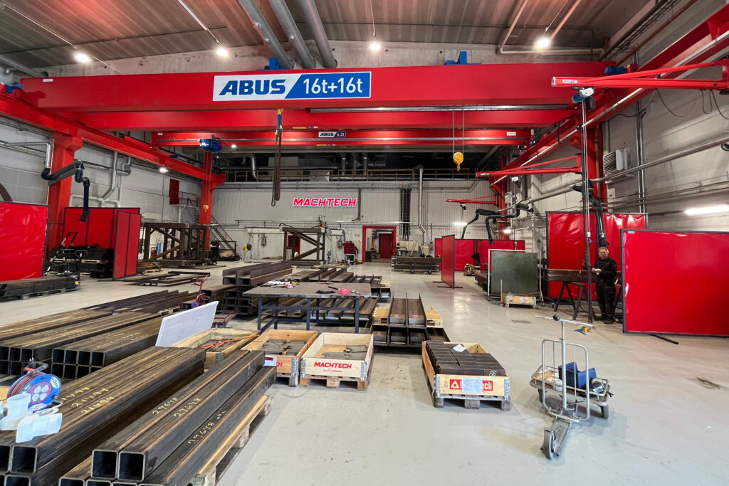 Traverserna har en spännvidd på 23 meter och levererades i delar. Montaget skedde med lastbilskran med hjälp av Magnus Sjökvists Transport. Det kändes lite osäkert hur man skulle få in dem i lokalen och ett tag funderade man på att göra hål i taket som en nödlösning. Men det behövdes inte och trots den trånga nerfarten gick allt otroligt fort och smidigt. Totalt tog leveransen tolv veckor från order till installation. Våren 2023 var allt klart, besiktigat och lyftutrustningen nymålad i Machtechs härligt klarröda färg.